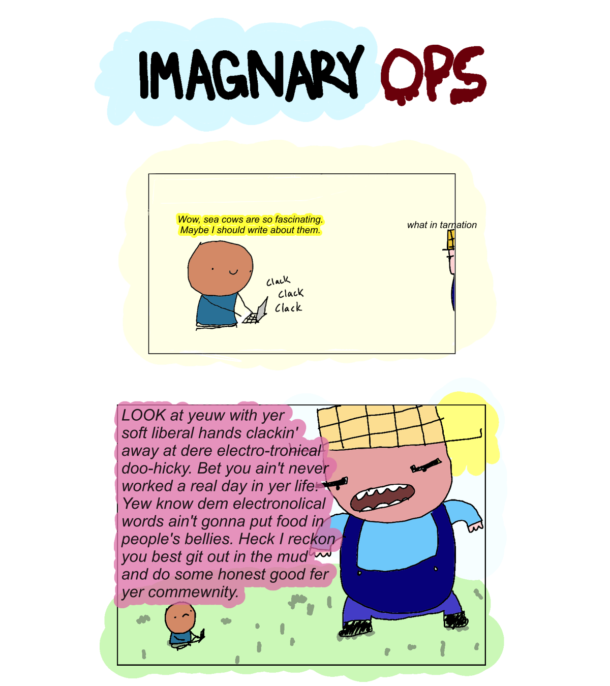 Sometimes they’re projections of my parents. Sometimes my friends. But more often than not, it’s just this angry, anti-tech, Iowan farmer who’s constantly criticizing me for doing things on the computer.